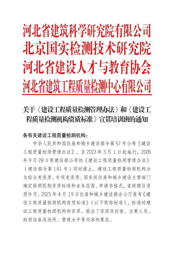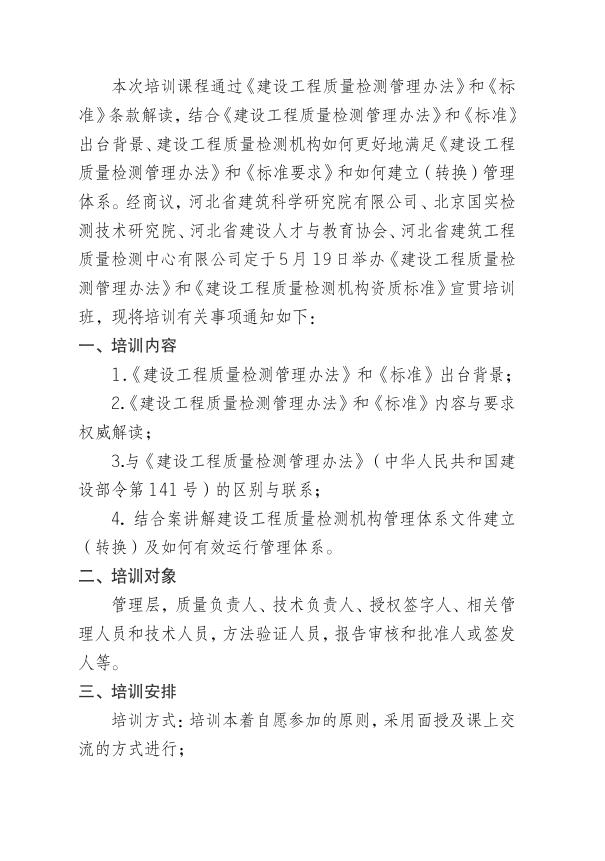 關(guān)于《建設(shè)工程質(zhì)量檢測管理辦法》和《建設(shè)工程質(zhì)量檢測機構(gòu)資質(zhì)標準》宣貫培訓班的通知