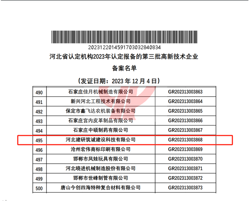 2023年12月20日,全國高新技術(shù)企業(yè)認(rèn)定管理工作領(lǐng)導(dǎo)小組辦公室公示了河北省認(rèn)定機(jī)構(gòu)2023年認(rèn)定報備的第三批高新技術(shù)企業(yè)備案名單,河北建研筑誠建設(shè)科技有限公司順利通過了國家高新技術(shù)企業(yè)認(rèn)定(證書編號GR202313003868),標(biāo)志著公司在科技創(chuàng)新的道路上又邁出了堅實(shí)的一步。