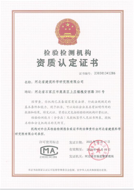 河北省建筑科學(xué)研究院有限公司CMA證書(shū)