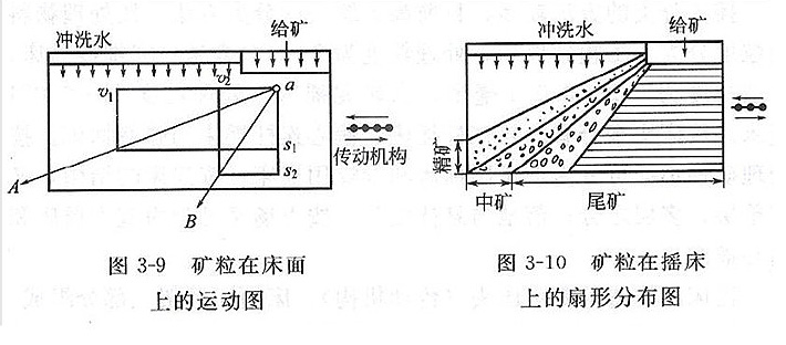 搖床是用于選別細(xì)粒礦料的重力選礦設(shè)備。 搖床的選礦過程是在具有來復(fù)條的床面上進(jìn)行的,礦粒群從床面上角的給礦槽送入,同時(shí)由給水槽供給橫向沖洗水,于是礦粒在重力,橫向流水沖力,搖床床面作往復(fù)不對(duì)稱運(yùn)動(dòng)所產(chǎn)生的慣性和磨擦力的作用下,按比重和粒度分層,并沿?fù)u床床面做縱向運(yùn)動(dòng)和沿傾斜床面做橫向運(yùn)動(dòng)。因此比重和粒度不同的礦粒沿著各自的運(yùn)動(dòng)方向逐漸沿對(duì)角線呈扇形流下,分別從精礦端和尾礦側(cè)的不同區(qū)排出,然后被分成精礦,中礦和尾礦。