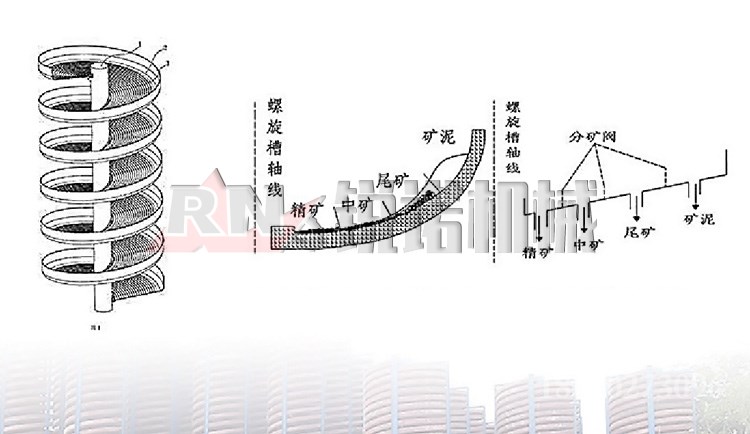 將螺旋溜槽立起,校準(zhǔn)垂直線,用鐵架或木頭固定在合適的位置,由砂泵將礦砂送到螺旋上頂兩個(gè)進(jìn)料口處,加入補(bǔ)充水,調(diào)節(jié)礦槳濃度,礦槳自然從高往下旋流, 在旋轉(zhuǎn)的斜面流速中產(chǎn)生一種慣性的離心力,以礦砂的比重、粒度、形狀上的差異,通過旋流的重力和離心力的作用,將礦與砂分開,精礦流入精礦斗用管道接出, 尾砂流進(jìn)尾砂斗用管道接到砂池,再用砂泵排走,完成了選礦的全過程。