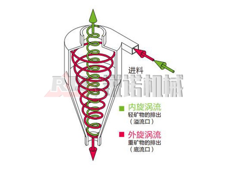水力旋流器用砂泵(或高差)以一定壓力(一般是0.5~2.5公斤/厘米)和流速(約5~12米/秒)將礦漿沿切線方向旋入圓筒,然后礦漿便以很快的速度沿筒壁旋轉而產生離心力。通過離心力和重力的作用下,將較粗、較重的礦粒拋出。